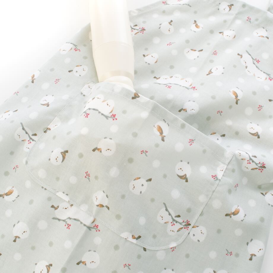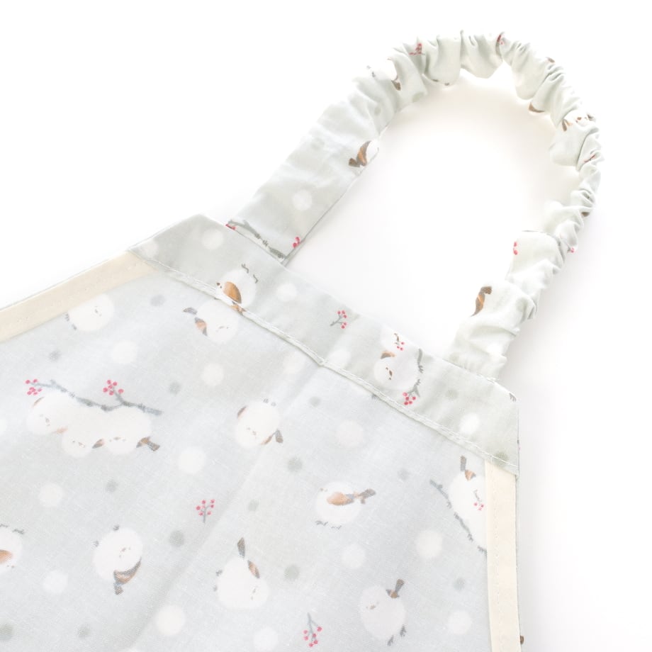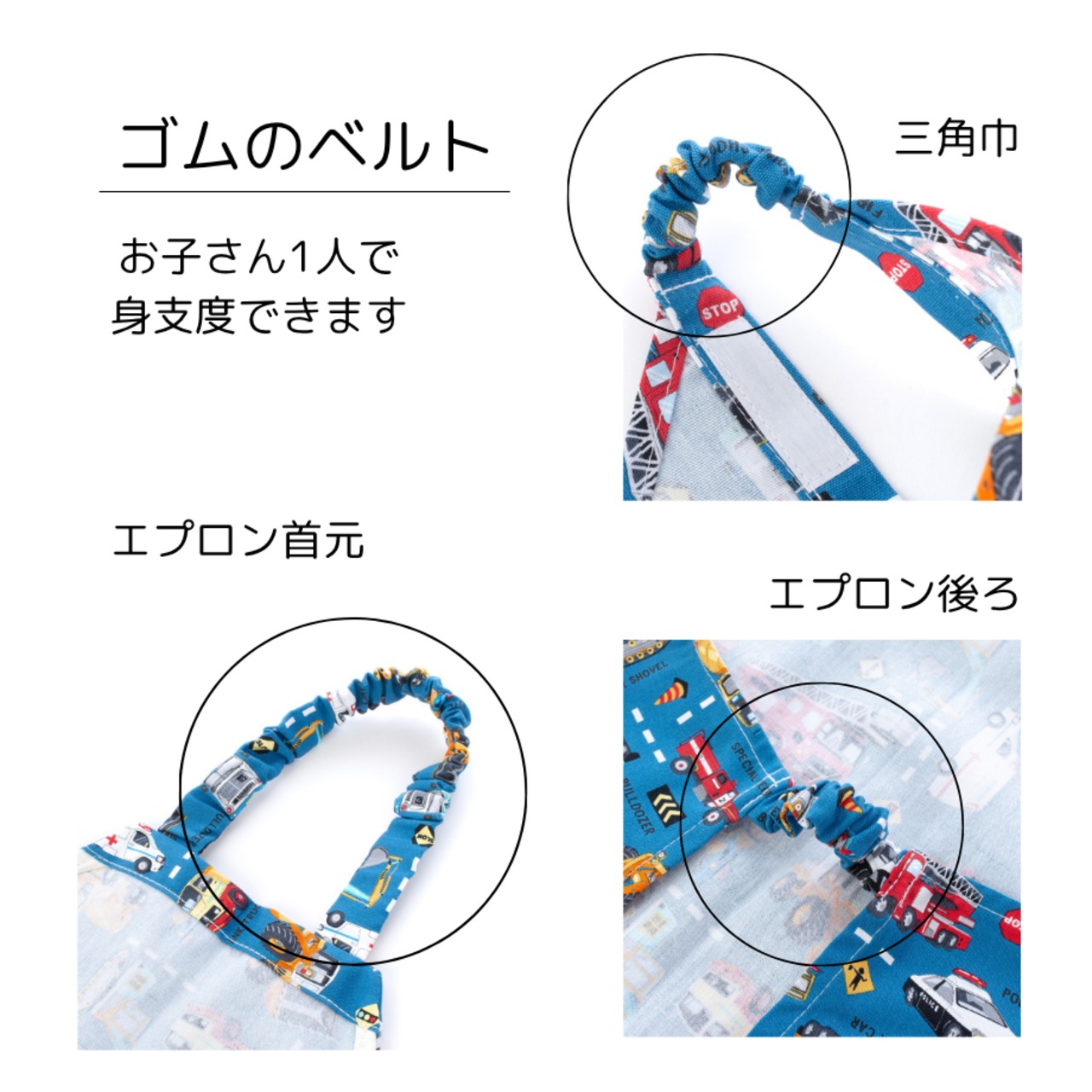 エプロンの首元と後ろの腰部分、三角巾の後ろもゴムベルトになっていますので、お子さん一人で身じたくできます。